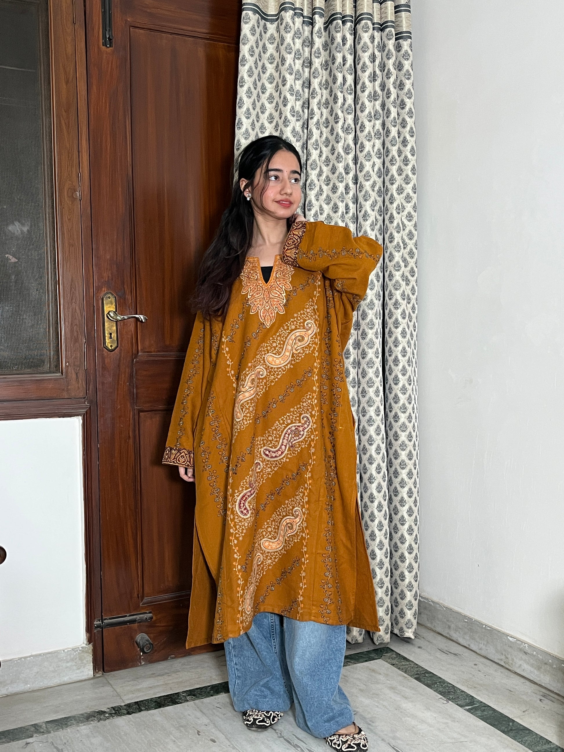 Shaili sozni Woollen Kashmiri Pheran- Mustard