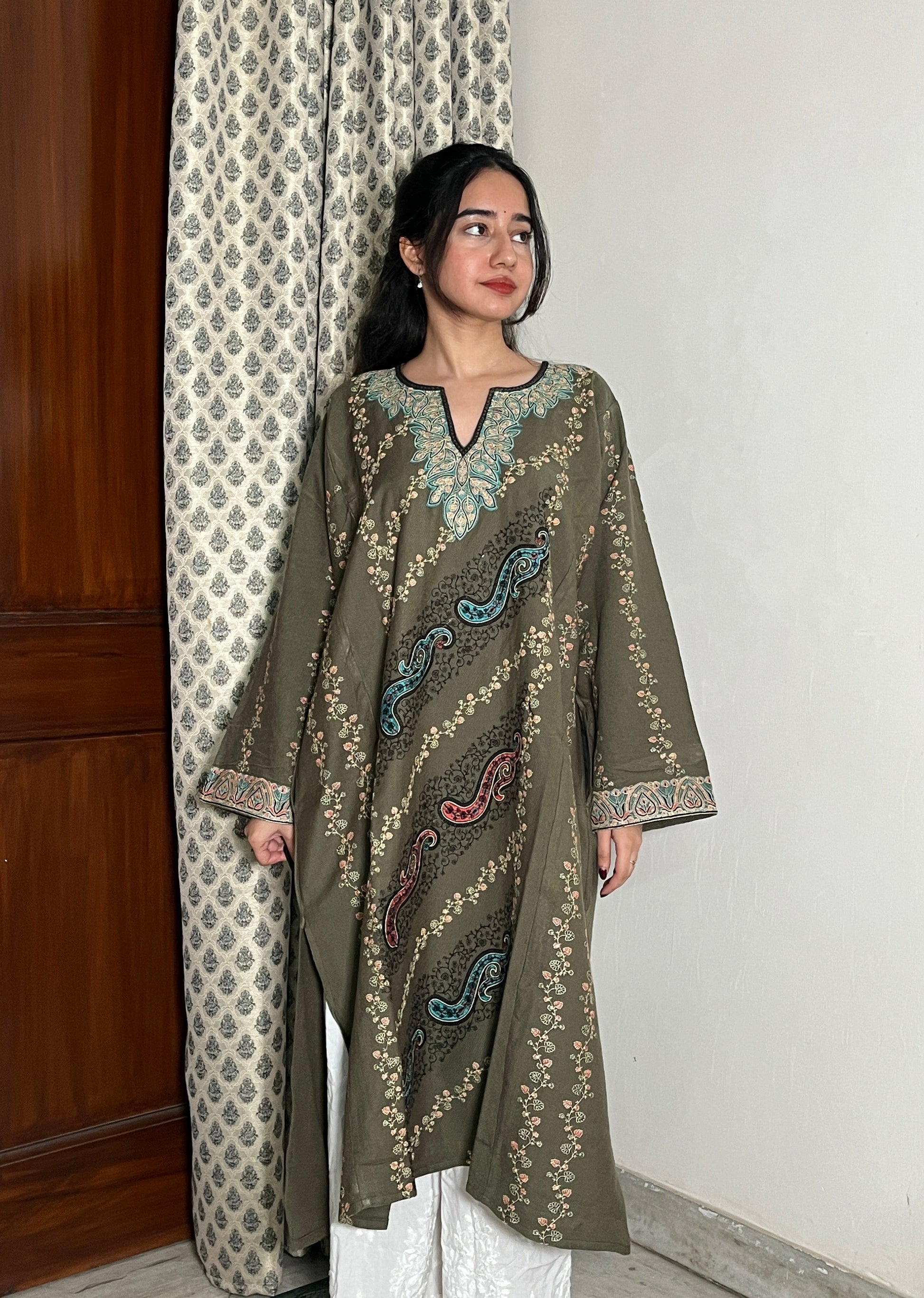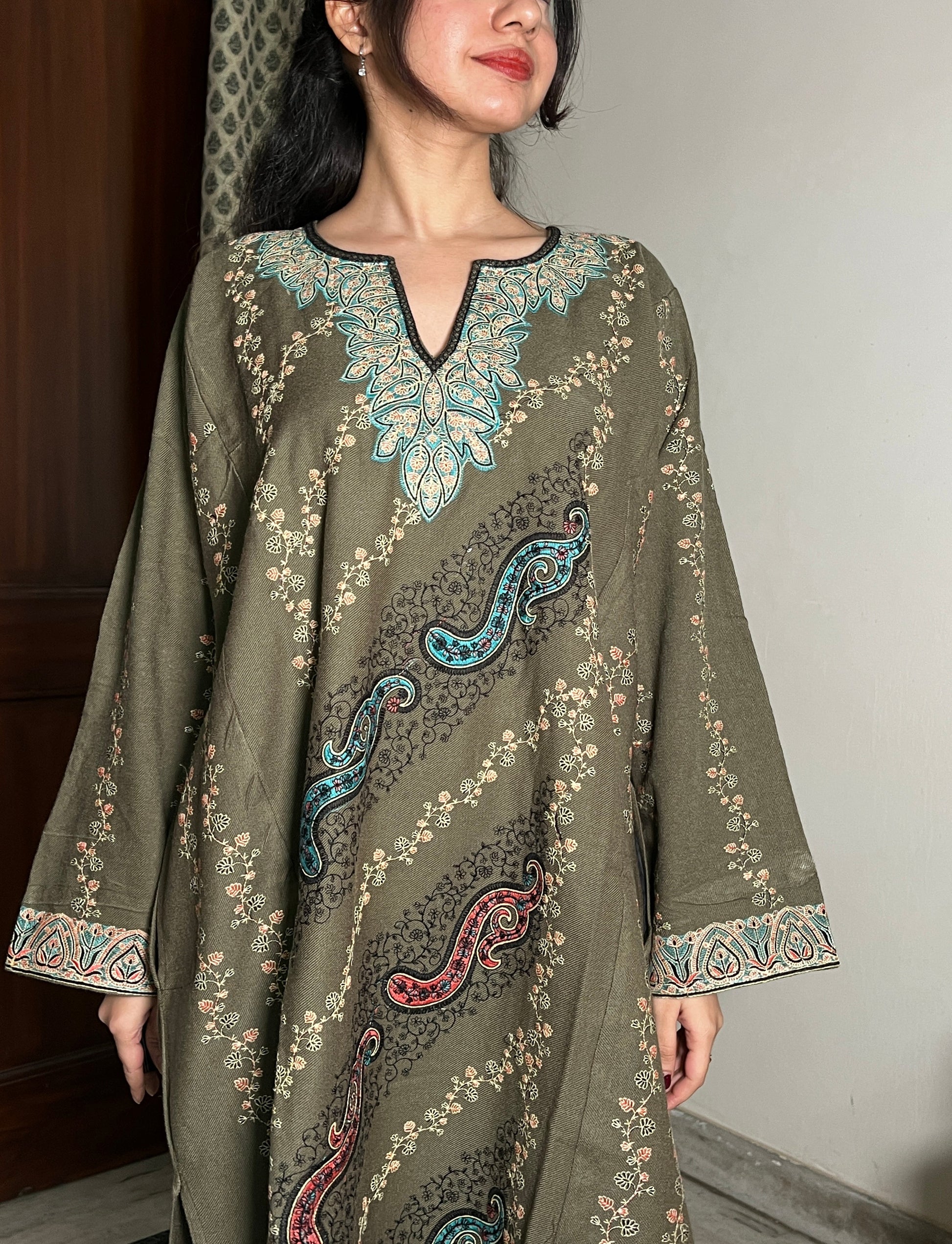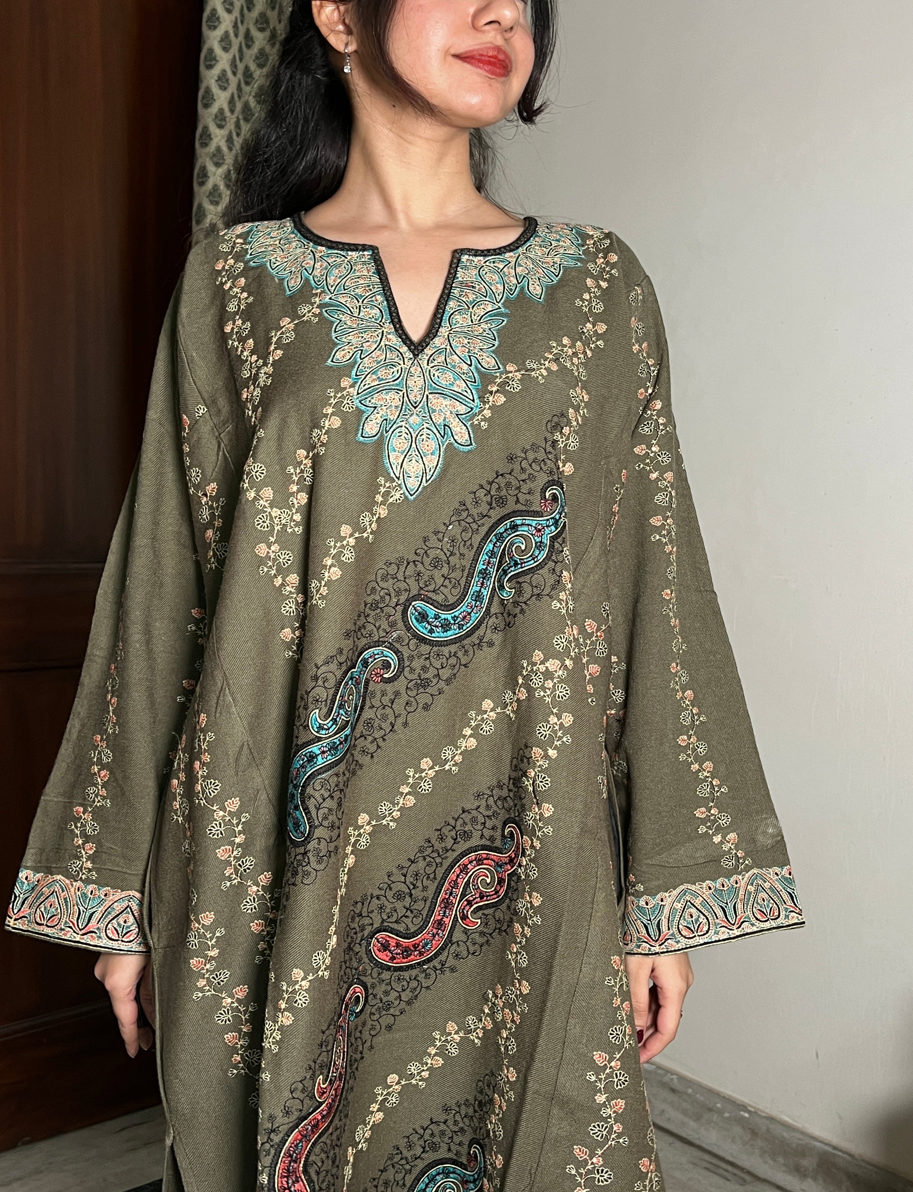 Shaili sozni Woollen Kashmiri Pheran- Olive Green