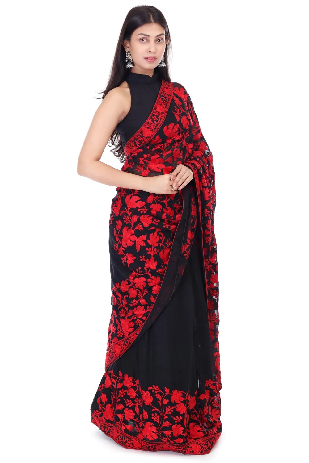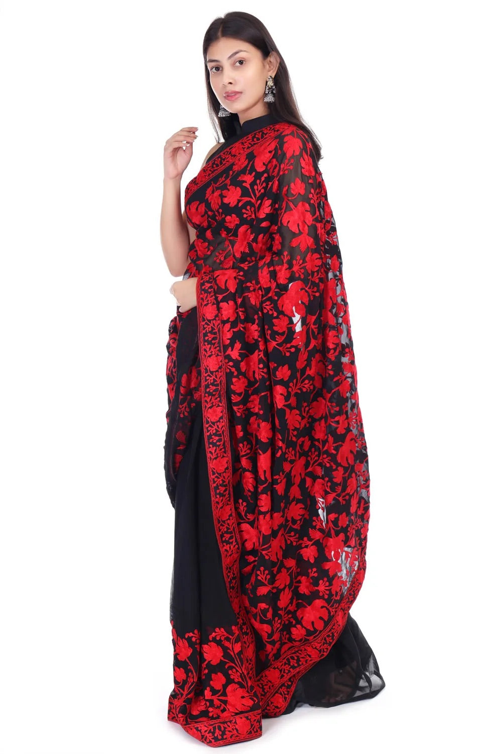 - black saree with red chinar embroidery
